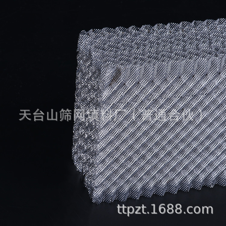 网孔波纹填料也叫板网波纹填料,结构与通常波纹填料相似,基材使用菱形孔的钢板网,冲压制成波纹片,具有金属丝网波纹填料优良的分离性能。